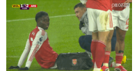 比赛第72分钟,萨卡坐在地上疑似出现伤情,1分钟后他被特罗萨德换下。
